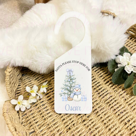 Personalised Christmas Santa Stop Here Door Hanger - Snowman Pink/Blue Design