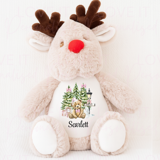 Personalised Christmas Reindeer Teddy - Pink/Blue Bear Scene Design