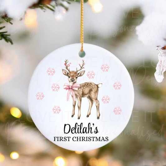 Personalised First Christmas Ceramic Ornament - Pink/Blue Reindeer Design