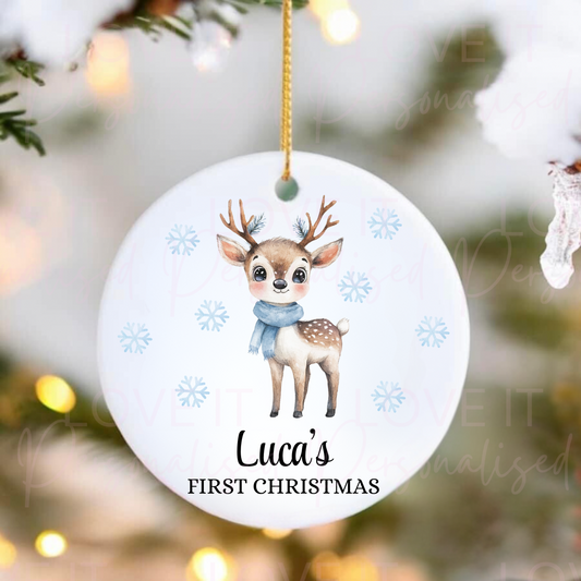 Personalised First Christmas Ceramic Ornament - Pink/Blue Baby Reindeer Design