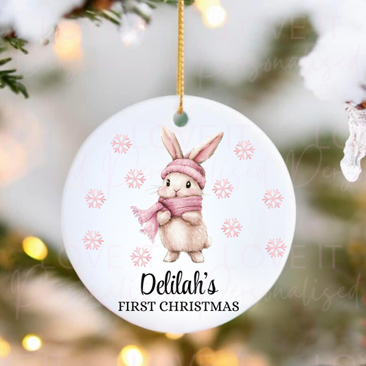 Personalised First Christmas Ceramic Ornament - Pink/Blue Rabbit Design