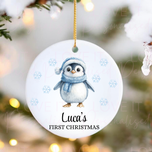 Personalised First Christmas Ceramic Ornament - Pink/Blue Penguin Design
