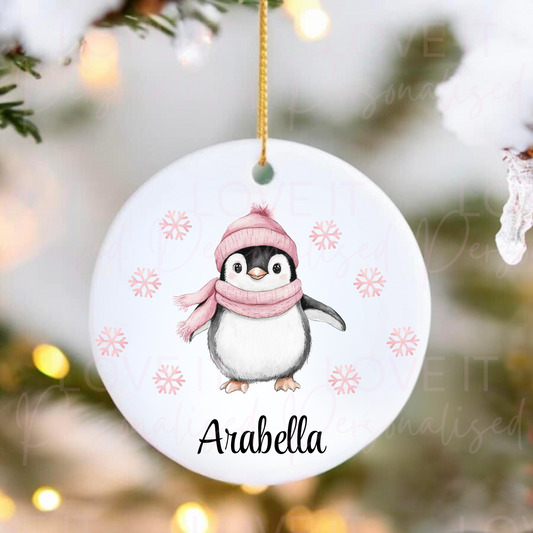 Personalised Christmas Ceramic Ornament - Pink/Blue Penguin Design