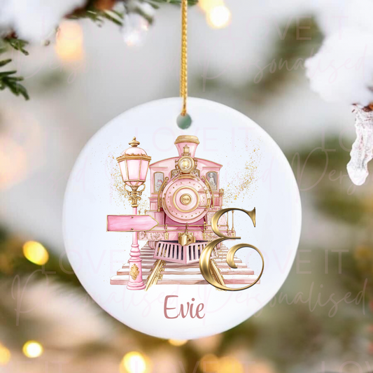 Personalised Christmas Ceramic Ornament - Pink/ Blue Train Design