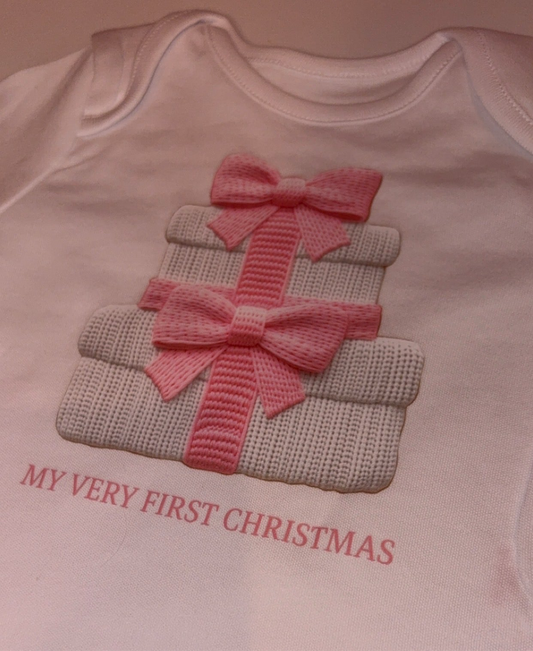 First Christmas Pink Knitted Effect Baby Bodysuit - Short/Long Sleeve