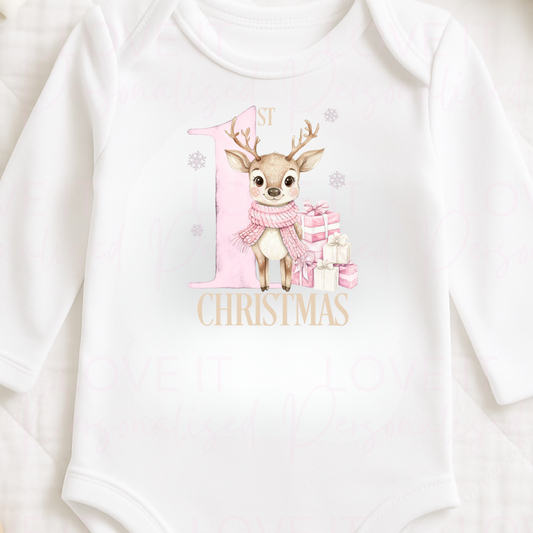 First Christmas Pink/Blue Reindeer Baby Bodysuit - Short/Long Sleeve