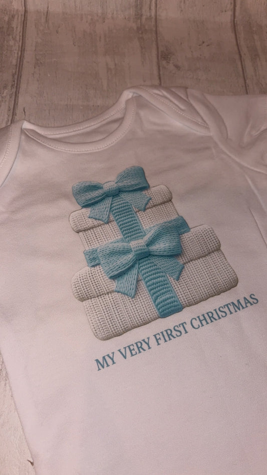 First Christmas Blue Knitted Effect Baby Bodysuit - Short/Long Sleeve