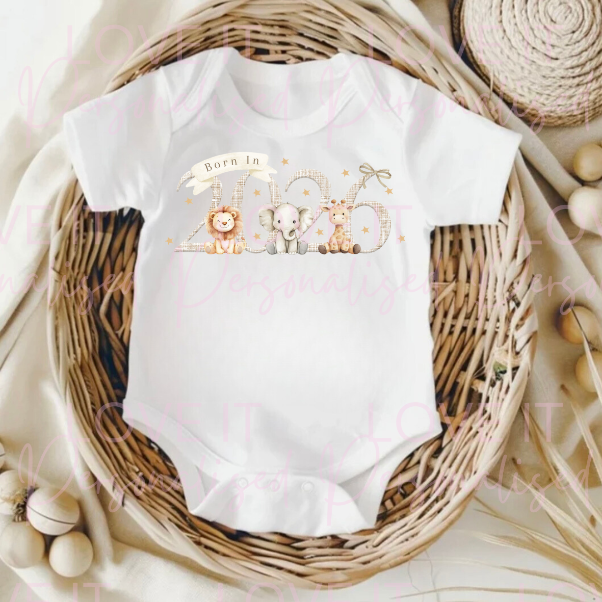 Born In 2026 Safari Animals Baby/Pregnancy Announcement Baby Bodysuit